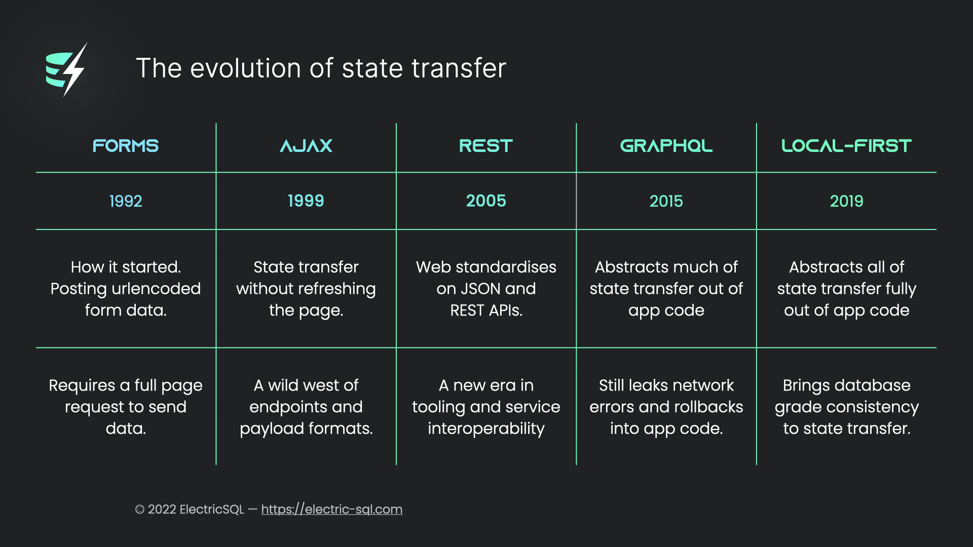 Web development has been progressing through an evolution of state transfer. Local-first is the natural endgame and the vision we're working towards with Electric.