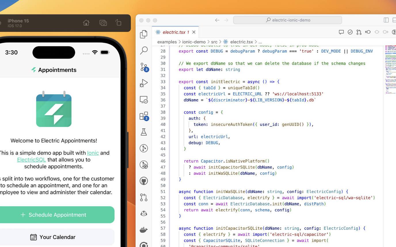 The pairing of ElectricSQL with the Ionic Framework and Capacitor is a compelling route for rapid application development. It results in a single codebase for web, iOS and Android apps, along with full offline and collaborative real-time support.
