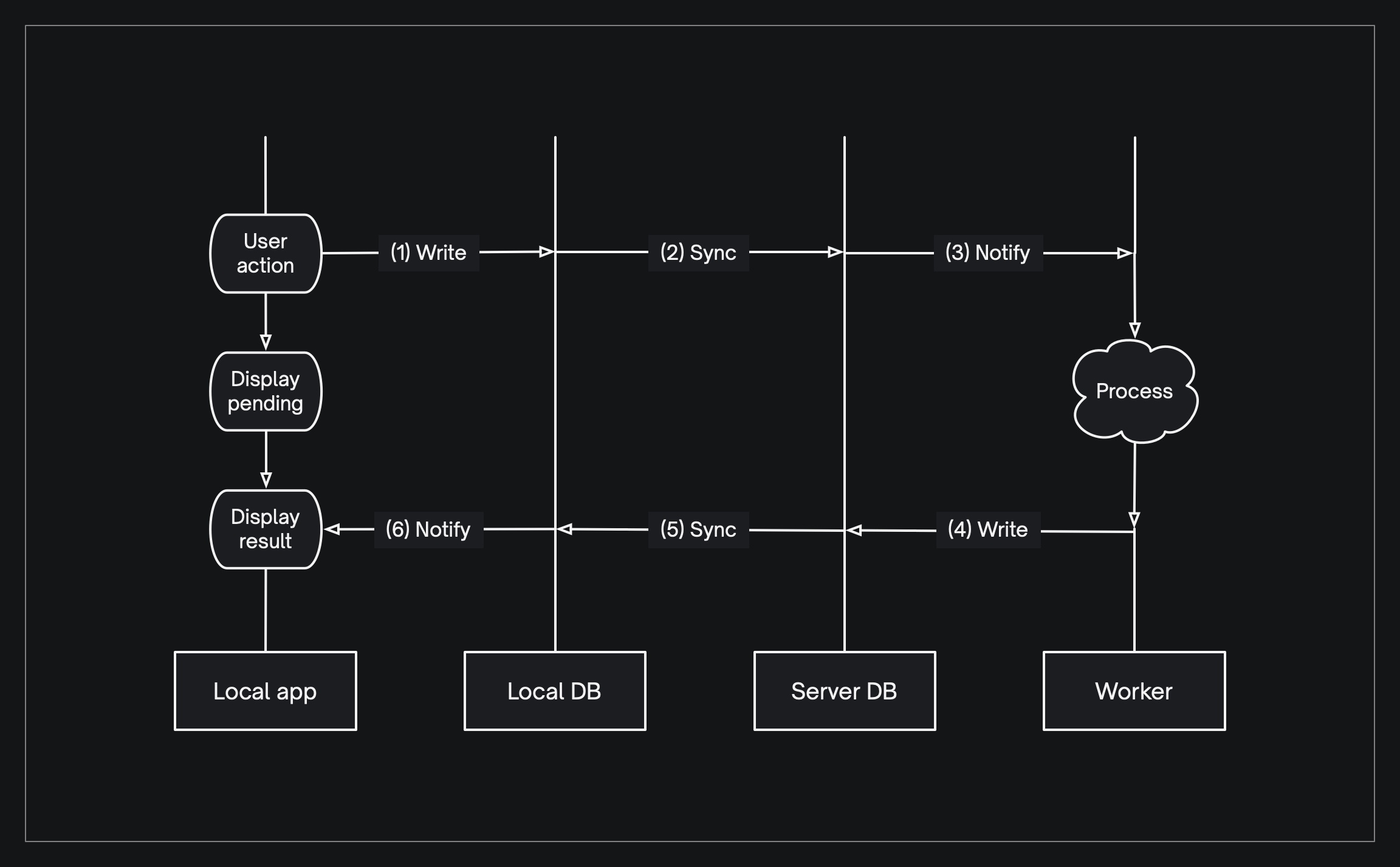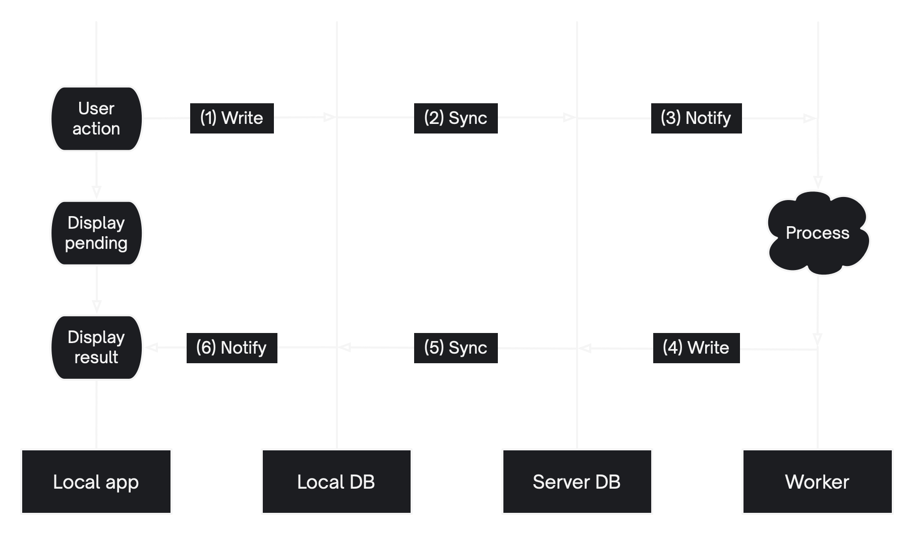 As you can see, it's a simple pattern to emulate request - response over the local-first replication stream. There's no out of band data or consistency concerns. And all the actual state transfer should be handled for you automatically by the sync layer.